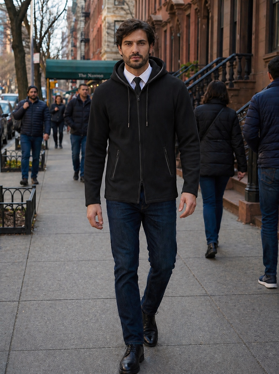 Cette veste à capuche mi-longue est conçue en polyester 100%, avec un tissu extérieur très lisse offrant un rendu moderne et soigné. Sa doublure polaire fine apporte une légère chaleur sans alourdir la silhouette, idéale pour un usage quotidien. Grâce à sa conception légère, elle est parfaitement adaptée aux climats doux, notamment dans les îles pendant la période des alizés. Elle convient particulièrement pour les saisons automne, printemps et début d’hiver, où les températures restent modérées. Sa coupe structurée et son design épuré en font une pièce polyvalente, facile à porter aussi bien en tenue casual qu’avec une tenue plus habillée